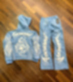 Features all puff printed logos, hoodies are cropped with raw edge bottom, Flair sweat pants & both hoodie and pants have been dye washed to give material a stained detailed looks